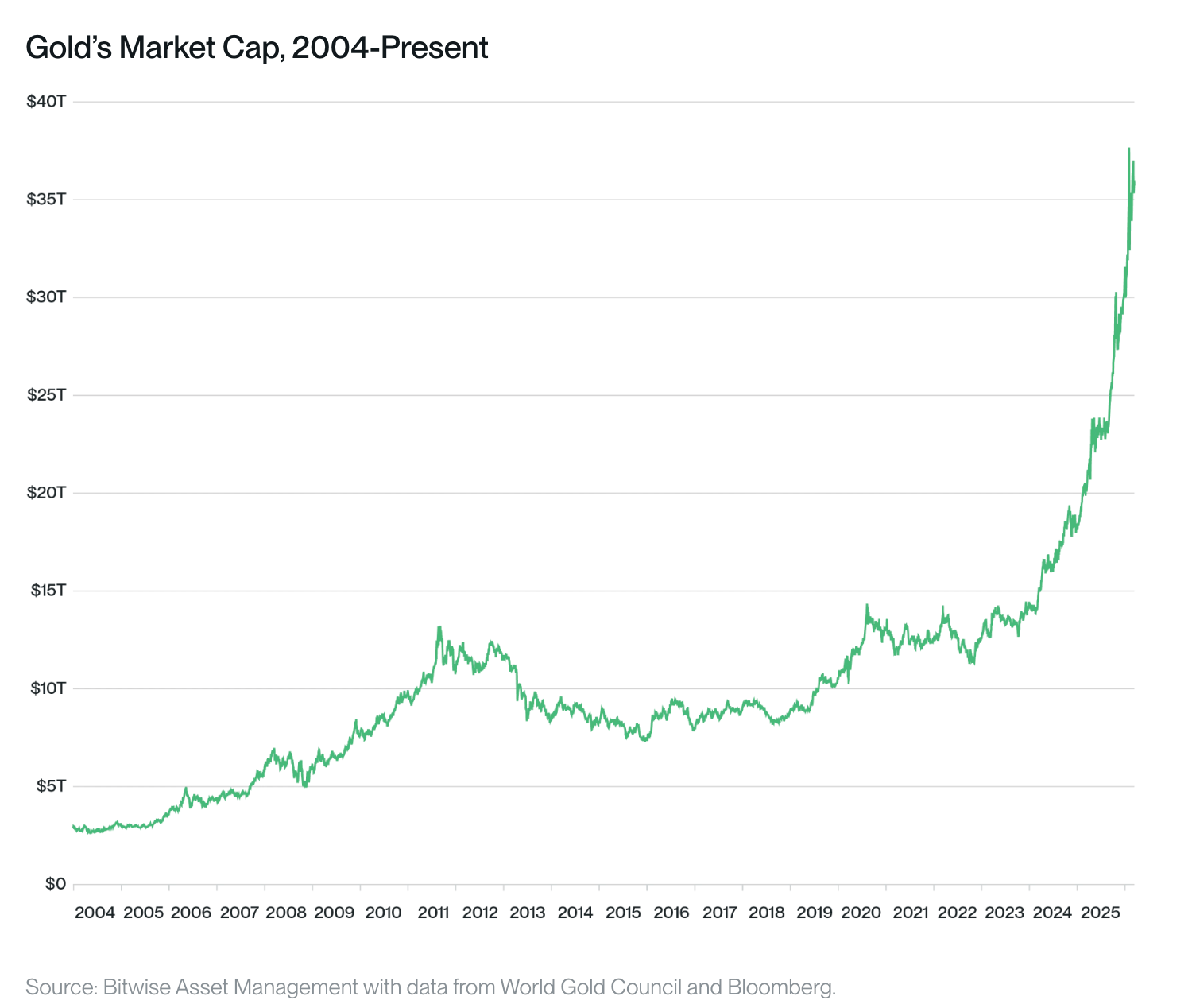 The global SoV market sits at ~$38T today, with gold at ~$36T and BTC at ~$1.4T, giving BTC just under 4% market share.