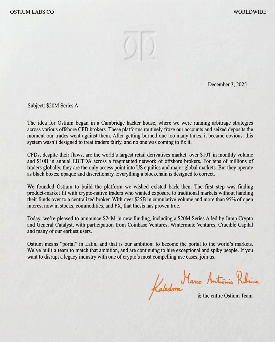 Ostium, an Arbitrum based exchange for real world asset perpetuals, raised $24M in new funding, including a $20M Series A led by General Catalyst and Jump Crypto. The round values the company at about $250M.