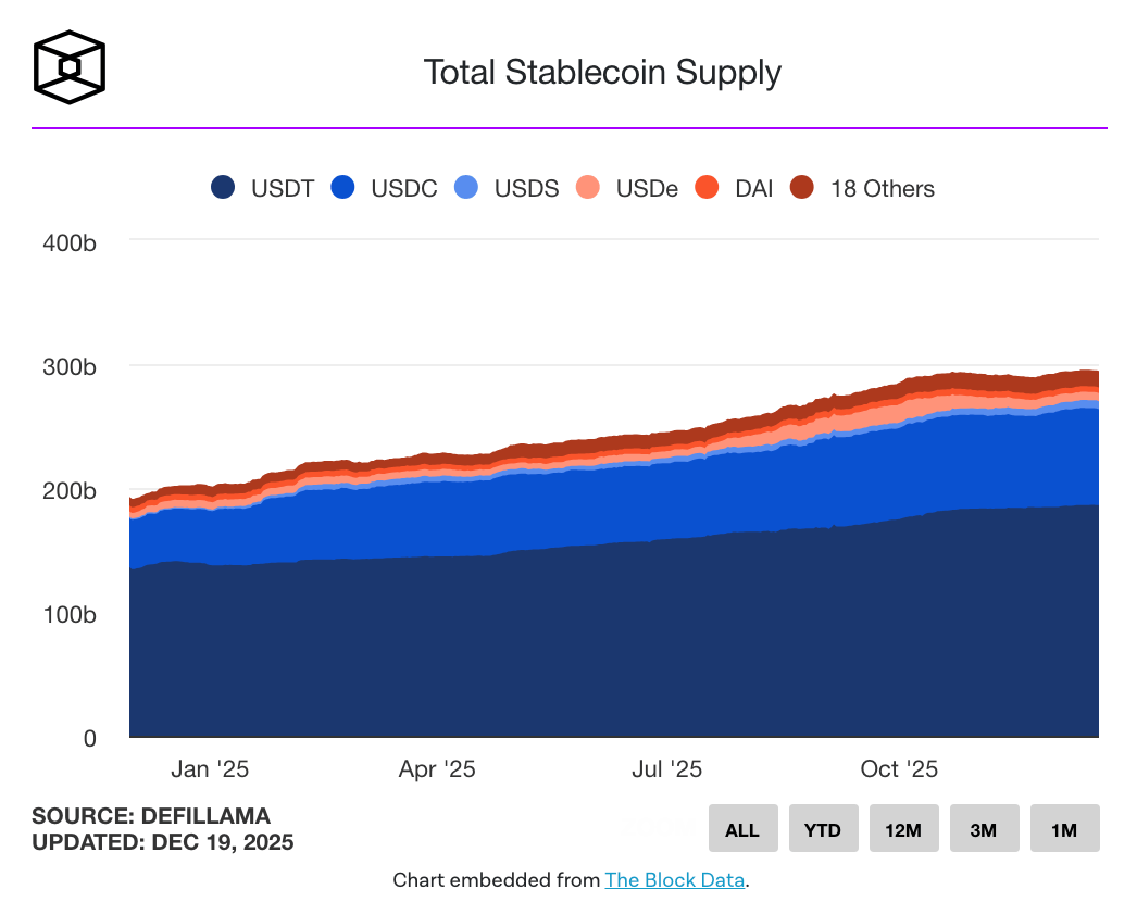 The bank noted that stablecoin supply has grown by roughly $100B this year to over $300B, with most of the increase coming from USDT and USDC.