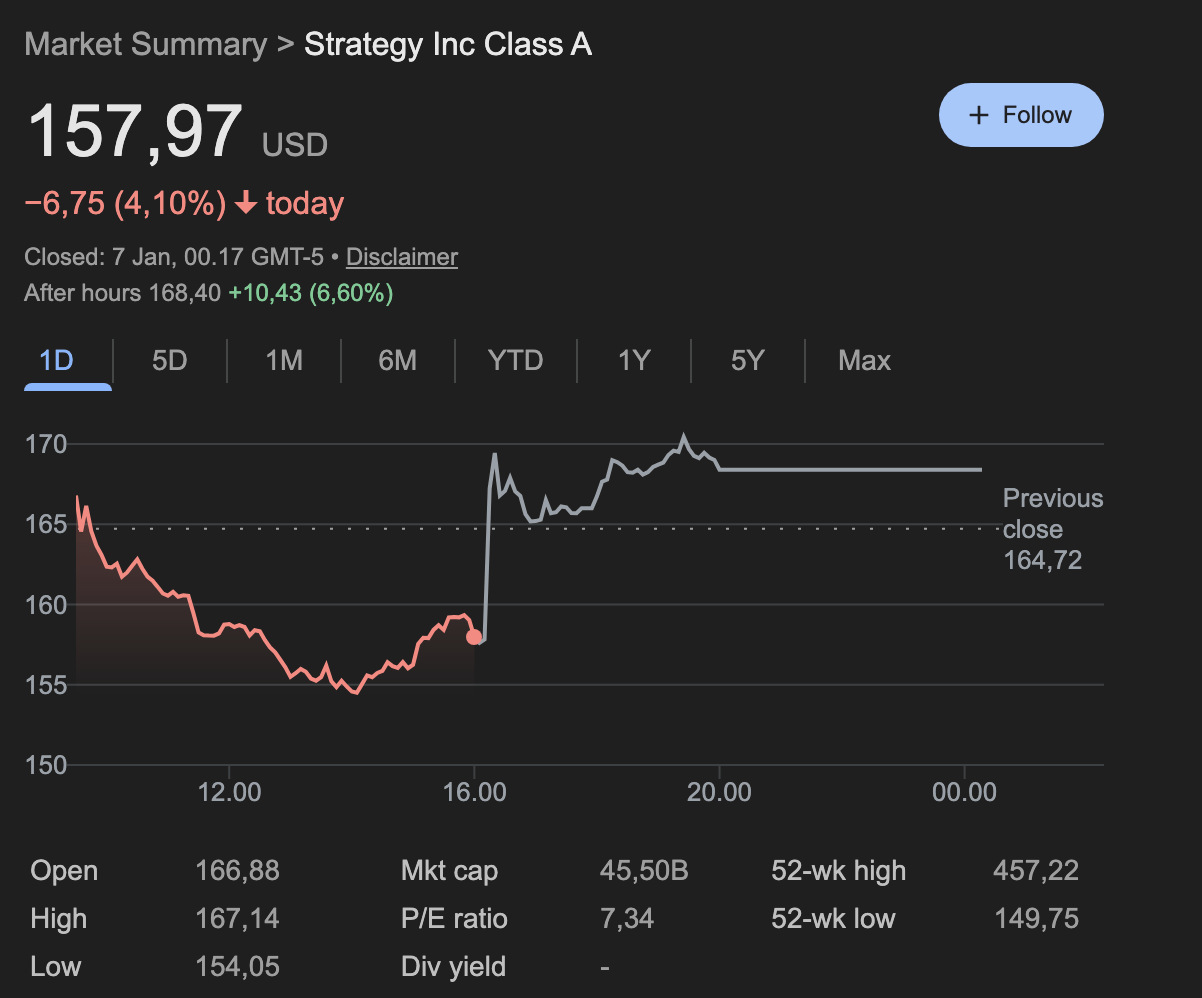 State of play: Strategy’s stock rose about 5% after MSCI said it will not, for now, exclude companies with large digital asset treasuries from its equity indexes.