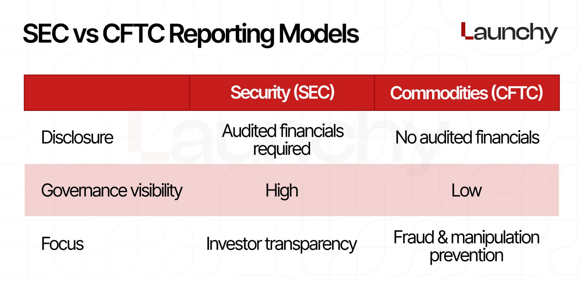 Traditional securities law requires extensive financial and managerial disclosure. The CFTC’s commodity model does not. Under Section 204 of H.R. 5745, exchanges must report trade data to a Digital Asset Repository of Transactions but are not required to publish audited financials or governance information.