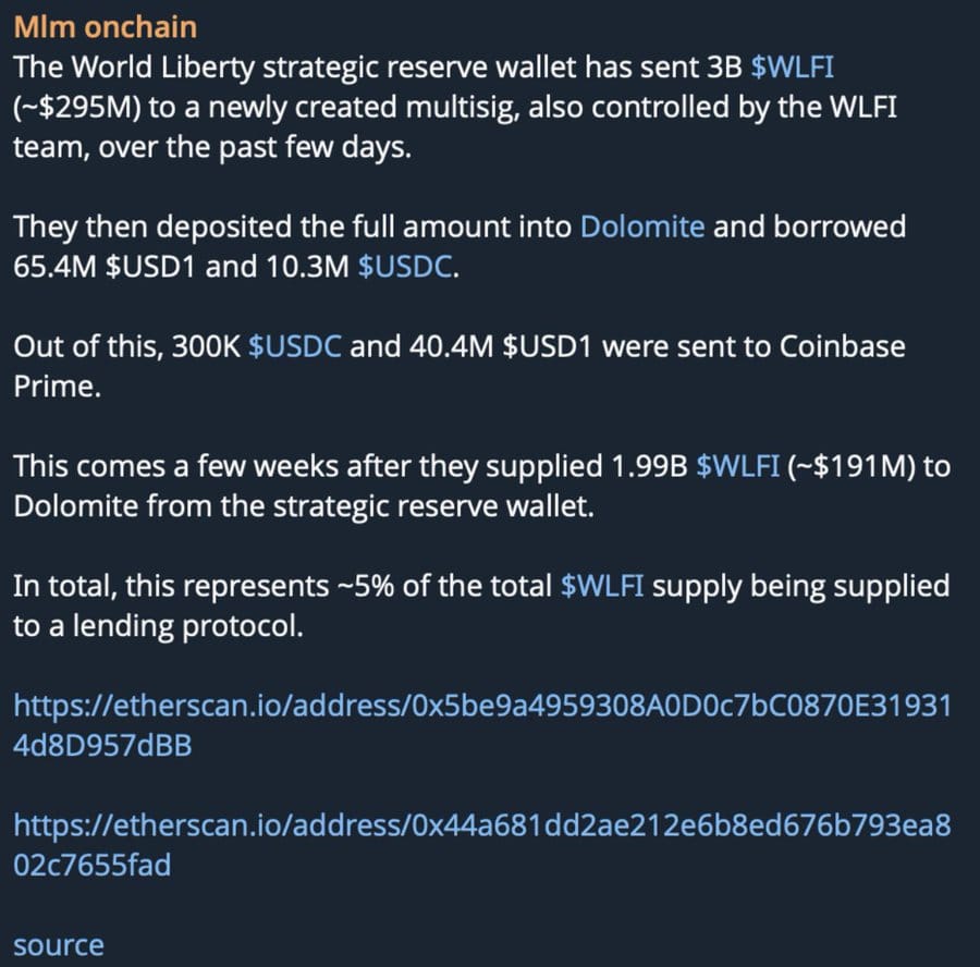 WLFI deposited ~5B WLFI on Dolomite as collateral to borrow $75M in stablecoins, transferring $40M+ to Coinbase Prime hours before Trump's US-Iran ceasefire announcement.